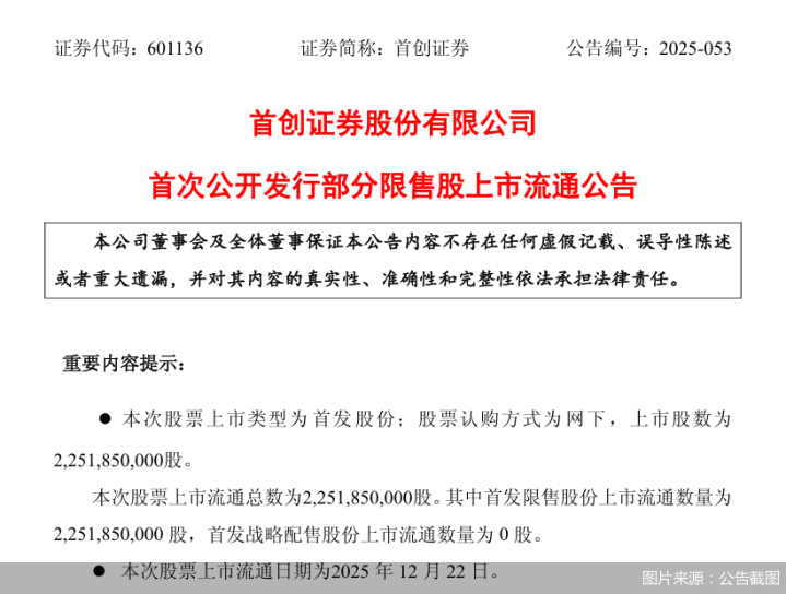 首创证券: 22.52亿股首发限售股份将于12月22日起上市流通